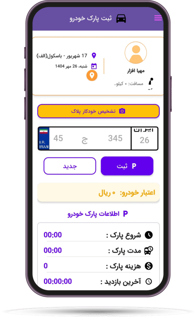 - ثبت عملیات پارک خودرو همراه با پلاک، زمان، موقعیت و تصویر